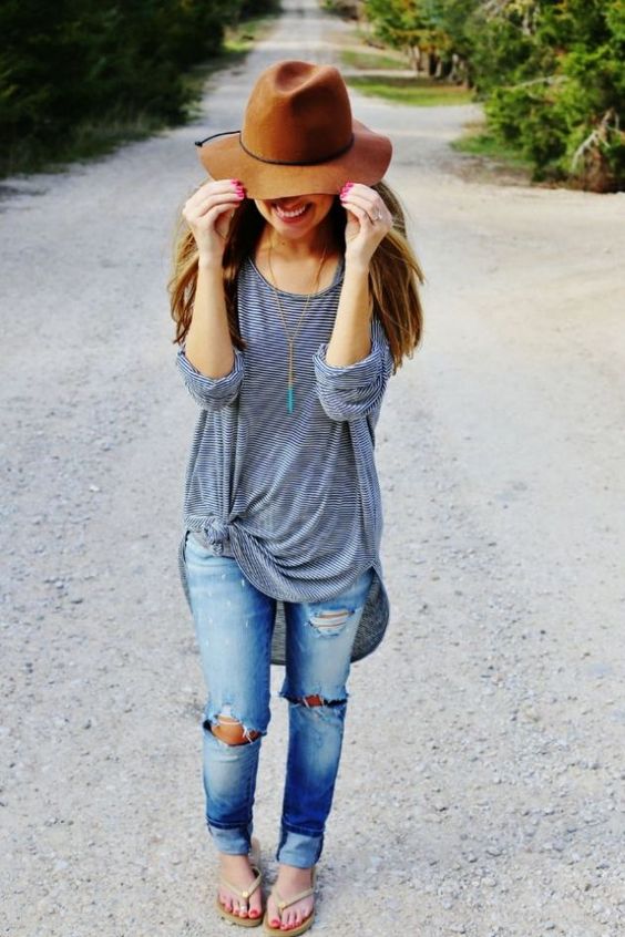 Si tienes sombreros estilo boho, aprovecha y combina con unos ripped jeans y blusa XL amarrada.