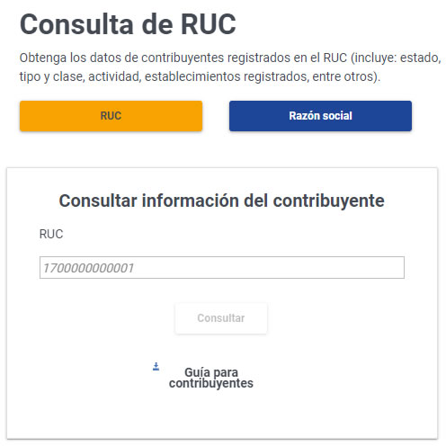 Si prefiere verificar el RUC de una persona con su número de cédula, simplemente ingrese el número de cédula en la plataforma, seguido de ‘001’. Por ejemplo, para una cédula 1712346789, ingrese ‘1712222222001’.